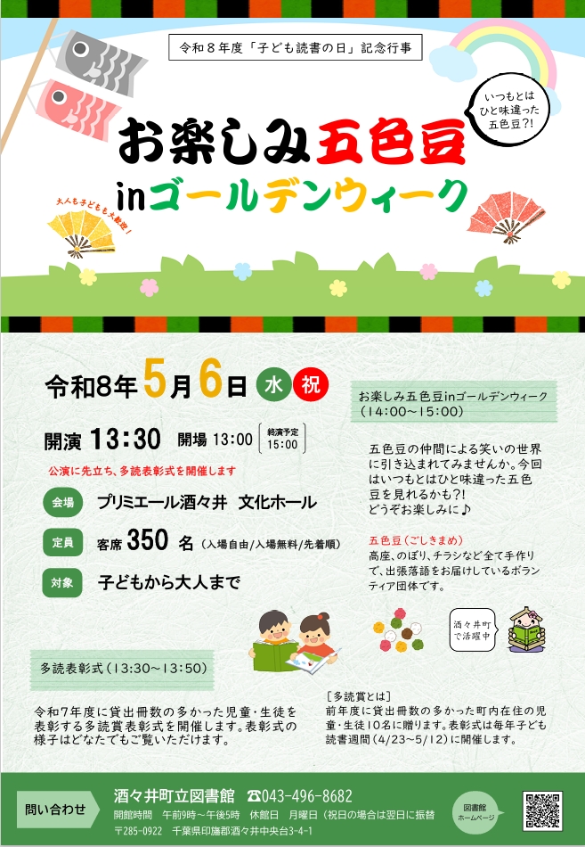 子ども読書の日(4月23日)を記念し、文化ホールにて多読表彰式及び公演会を開催します。